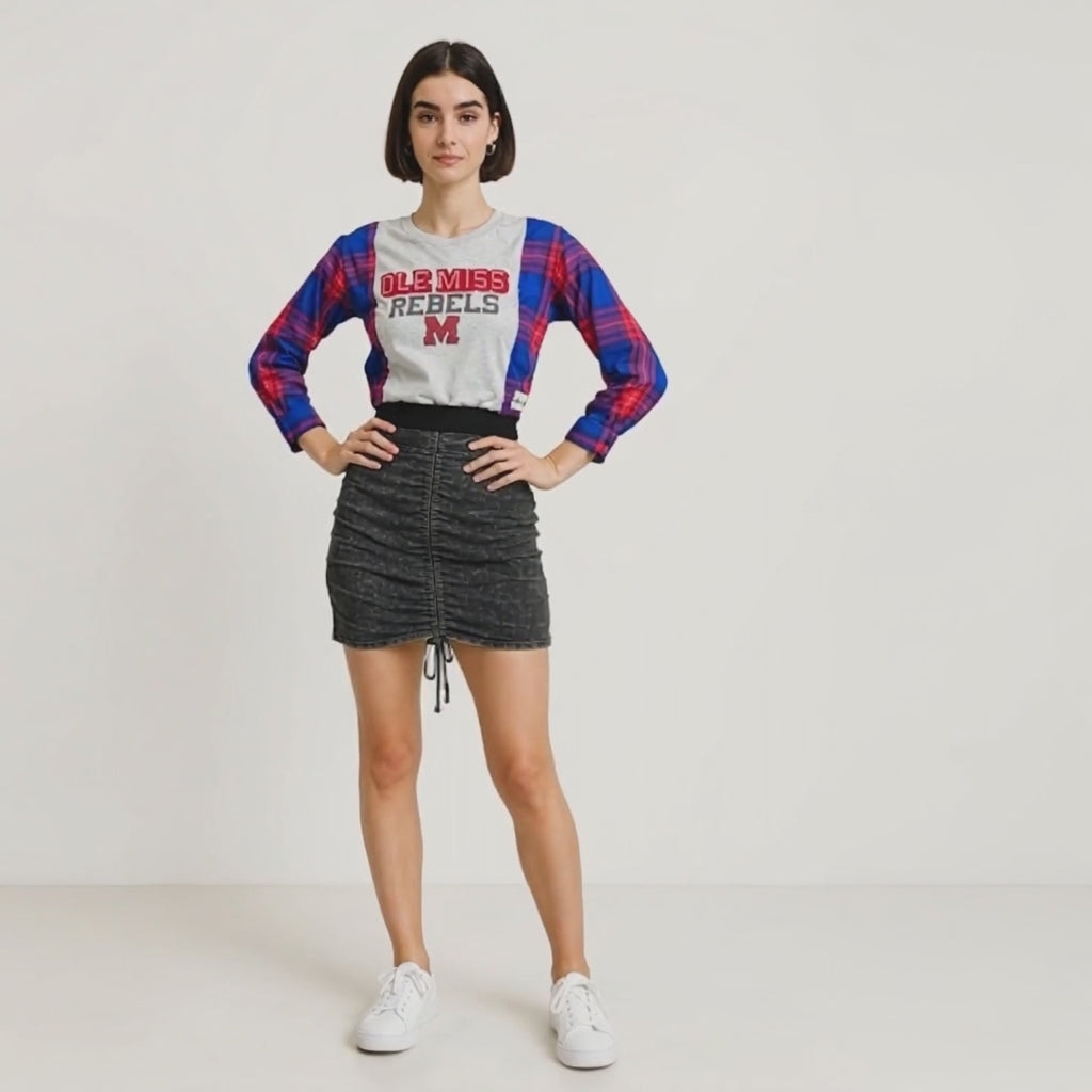 Rep Ole Miss with this one of a kind upcycle. We took a super comfy soft sweatshirt and added coordinating flannel arms with the cutest crop to sport year round on campus. Sustainably upcycled in Canada with zero waste sewing.